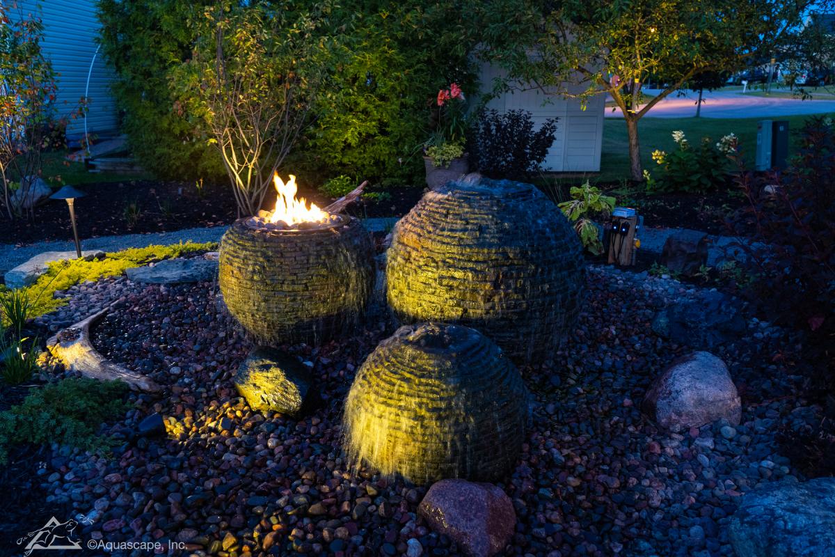 A Fountainscape is a decorative water feature, typically a bubbling urn, column, or rock that recirculates water from a hidden reservoir. It offers the elegance of a fountain with minimal maintenance and no open standing water.